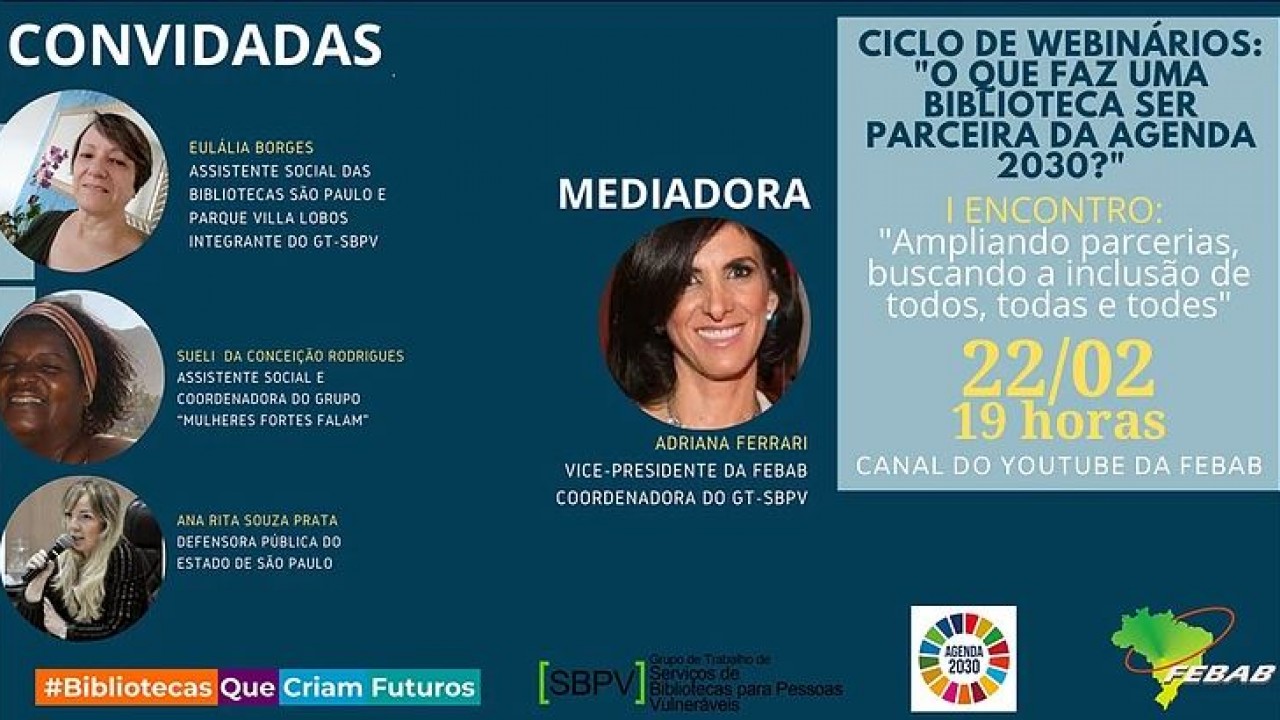 A FEBAB (Federação Brasileira de Associações de Bibliotecários, Cientistas da Informação e Instituições) realizará hoje, 22 de fevereiro, às 19h, encontro dentro do ciclo de webinários "O que faz uma biblioteca ser parceira da Agenda 2030?". A transmissão será pelo YouTube da instituição e contará com Maria Eulália Borges (coordenadora de Serviço Social da SP Leituras - Biblioteca de São Paulo e Biblioteca Parque Villa-Lobos), Sueli da Conceição Rodrigues (assistente social e coordenadora do grupo Mulheres Fortes Falam) e Ana Rita Souza Prata (Defensora Pública do Estado de São Paulo).